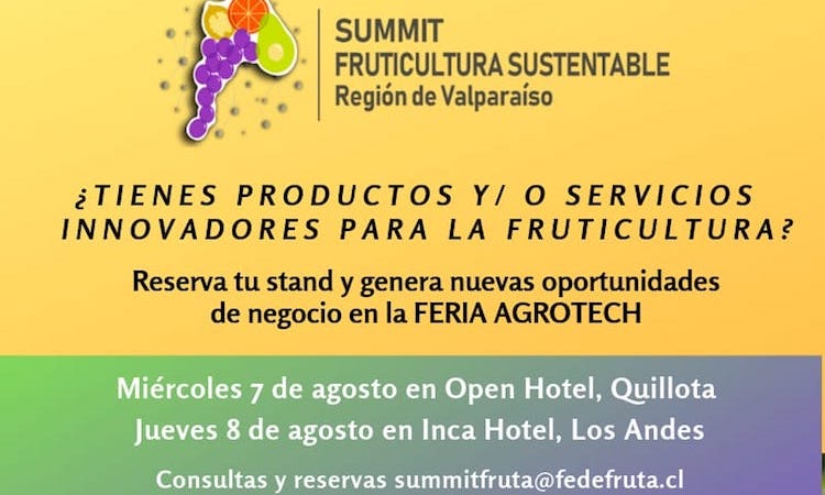 Se realizará el Summit de Fruticultura Sustentable en Quillota y Los Andes miércoles 7 y jueves 8 de agosto 06/08/2019 LEER ARTÍCULO